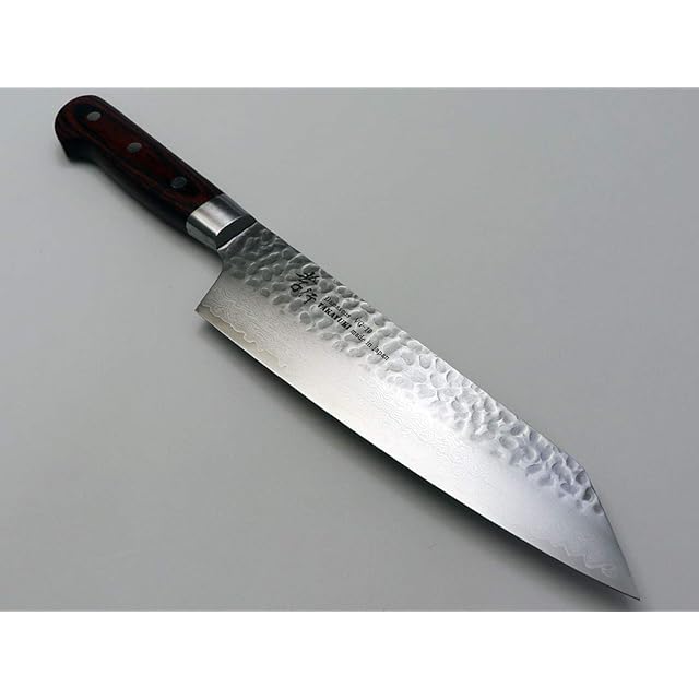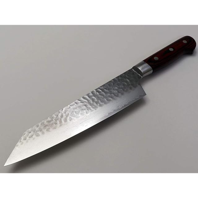 牛刀の先端を峯の側から削り、鋭くとがらせた剣型牛刀190ダマスカスです。<br> ※メーカー型番では190となっていますが、実際の刃渡りは200mmございます。<br> お肉はもちろん、野菜を刻んだり、鋭い先端を使って細かい細工をしたりと、幅広く使える万能包丁となっています。<br> 今までになかった使い勝手の良い包丁、ぜひ一度お試し下さいませ。<br> <br> 細かく美しい33層ステンレスダマスカス鋼の間に、錆びにくく切れ味のよい『V金10号特殊鋼』を挟み込み、こちらもより細かく美しい鎚目模様を付けた、とても素敵な洋包丁です。<br> <br> ミルフィーユのような多層鋼の美しい模様が魅力の包丁、叩いて鎚目を付けることにより、刀身自体が引き締まり、より切れ味を増します。<br> またハンドルは、握りやすく、腐りにくい強化木を使用、ツバ付ですので高級感があります。<br> <br> 全品両刃ですので、左利きの方でもまったく問題なくお使い頂けます。<br> <br> 刃渡り:200mm、全長:350mm、刃幅:50mm、刃厚2mm、重さ:220g、刃材:ステンレスダマスカスV金10号鋼割込、両刃<br> ※切れ味の良い薄刃造りですので、骨や冷凍食品などかたい物は切らないで下さい。<br> <br> ■「ダマスカス鋼」とは<br> <br> 名前の由来は、1,000年以上前の古代インドの独自の製鉄技術が起源で、その鋼材がペルシャ商人によってシルクロードから中東のダマスカス(シリア)まで伝わり、「ダマスカスの剣」と呼ばれるようになったことだとされています。<br> その後、ダマスカス鋼の製法は継承されておらず、現存する「ダマスカスの剣」を調査しながら再現が試みられています。<br> こうした背景からダマスカス鋼の存在自体が希少で「伝説」「神秘」とも例えられる存在です。<br> <br> 現在では、複数の金属を重ね合わせて作られた物が、"ダマスカス鋼"と呼ばれています。その製作工程によって生まれる、ブレード表面の独特の美しい模様が大きな魅力の一つとなっています。<br> <br> ※ダマスカス模様は同じ物はございません。<br> お届け時により、画像と変わることがございますので、ご了承下さい。<br> また、ダマスカスからの刃の出方も表裏で変わることがございます。