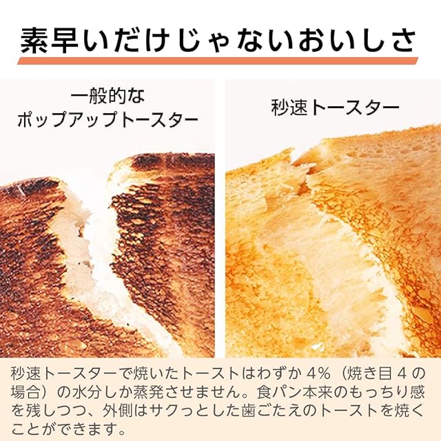 秒速トースターで焼いたトーストはわずか4%(焼き目4の場合)の水分しか蒸発させません! (一財)日本食品分析センター調べ 常圧加熱乾燥法 通常のトースターでは約10%、スチームトースターでも約7%の水分が蒸発します。 (自社調べ) 秒速トースターはほとんど水分を蒸発させないため、食パン本来のもっちり感を残しつつ、外側はサクっとした歯ごたえのトーストを焼くことができます。