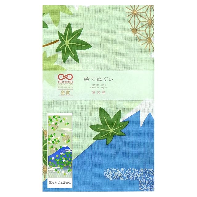 【夏もみじと富士山】<br> 爽やかな夏もみじの新緑に、<br> 季節の移ろいを感じる初夏の富士山柄。<br> 雲形や麻の葉柄で和風に構成しました。<br> 模様の一部にゴールド顔料を使用しています。<br> <br> 【絵てぬぐい】<br> 1枚の絵としてお飾りいただける「絵てぬぐい」は、<br> てぬぐいとしてはもちろん、季節感あふれるインテリアとしても好評です。<br> 横浜の粋と遊び心を持つ濱文様らしさに溢れた「絵てぬぐい」を是非お楽しみください。<br> <br> ◆素材:綿100% (厳選した木綿生地を採用しています)<br> ◆サイズ:約34cm×90cm (布の伸縮により多少の誤差があります)<br> <br> 【製品仕様】<br> ・横浜伝統の型染め手法である ”捺染 (なっせん)” でお作りしています。<br> ・柄のプリントは片面 (表) のみとなっております。<br> ・端を縫わない ”切りっぱなし” 仕様の、昔ながらのてぬぐいです。<br> ・ほつれは自然と止まりますので、適宜ハサミでカットしながらお使いください。<br> <br> 【注意事項】<br> ・色合いはご覧頂く環境によって印象が異なる場合があります。<br> ・濃色は色落ちする場合がありますので、単独での手洗いを推奨しております。<br> ・塩素系漂白剤はご使用にならないようお願いします。<br> ・濡れたまま重ね合わせたりすると色が滲む場合がありますのでご注意ください。<br> ・素材の特性上、洗濯をすると多少縮みます。<br> ・額装する場合は水通しせず、アイロンと霧吹きでシワを伸ばしてお飾りください。<br> <br> 【ブランド】<br> 横浜のテキスタイルブランド「濱文様」(はまもんよう) は、<br> 横浜伝統の型染め手法である ”捺染 (なっせん)” で染め上げた色あざやかな「てぬぐい」や<br> 風呂敷・タオル・ハンカチなどを中心に、数多くの和雑貨を企画・製造・販売しています。<br> <br> 遊び心のある個性的なデザインが特徴で、<br> 四季折々の風情を感じさせるオリジナルデザインを発信し続けています。<br>