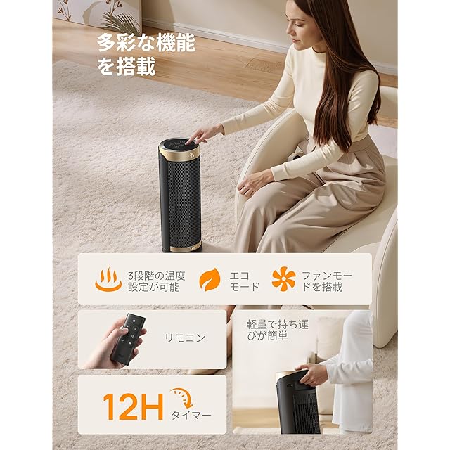 【コンパクトで操作簡単】わずか2.1kgの軽量設計&隠し取っ手付きで、お子様でも簡単に持ち運び可能。コントロールパネルでタッチ操作はもちろん、リモコンも付属しているので、約8m先からでも全ての機能を簡単に設定できます。ベッドやソファーにくつろぎながら、ぽかぽかの室内で冬を快適に。