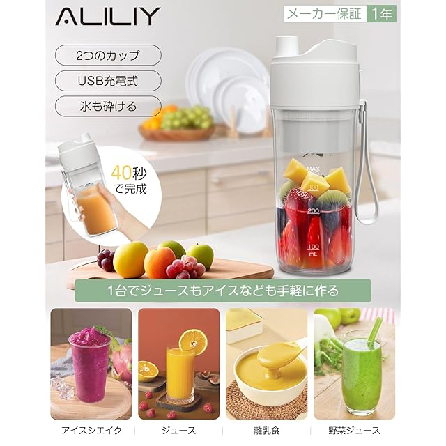 Aliliy ミキサー スムージー 小型 ジューサー 一台多役 2つコップ 野菜 果物 離乳食 氷も砕ける コードレス Type-C USB充電式 ブレンダー 340ML 3000mAh 健康ダイエット 一人暮らし 持ち運びやすい お手入れ簡単 アウトドア オフィス 旅行 出張 (白-2つのコップ)
