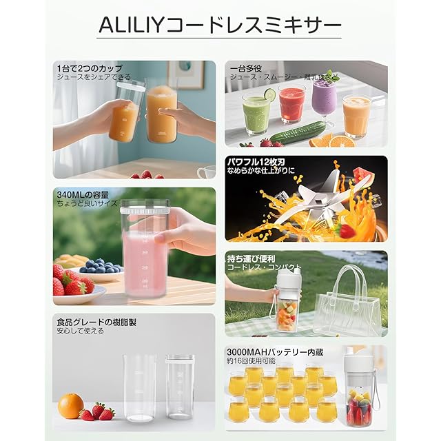 【重ねて収納できる2つのカップ・コンパクトで持ち運び便利】Aliliy小型ミキサーは重ねて収納できる2つのカップ付き、2つのカップの収納がひとつ分のスペースでできるから、収納場所をとりません。独自の飲み口設計により、ジュースを注ぎ出す手間を省き、新鮮な生搾りジュースをお楽しみいただけます。蓋は回転ロック式の為、いたずらなどによる蓋の開閉、内圧による蓋外れなどを防ぎます。蓋も漏れ防止のシリコンパッキンリングが取り付けられており、使用中の漏れの心配はありません。そのまま持ち運べる便利なコンパクトサイズ、コードレスタイプでアウトドアやオフィスやジムなど外出先に携帯したい方にもおすすめです。