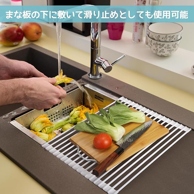 多様な使え方:この水切りラックは、まな板、鍋蓋、包丁などを竿の間に立て乾かすこともでき、野菜を切るときにはまな板の下に敷いて滑り止めとしても使用でき。不要な幅が気になる場合は、お好みの幅にカットして調整することも可能。