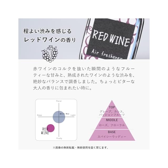 赤ワインのコルクを抜いた瞬間のようなフルーティーな甘味と、熟成されたワインのような渋みを、絶妙なバランスで調香。ちょっとビターな大人の香り