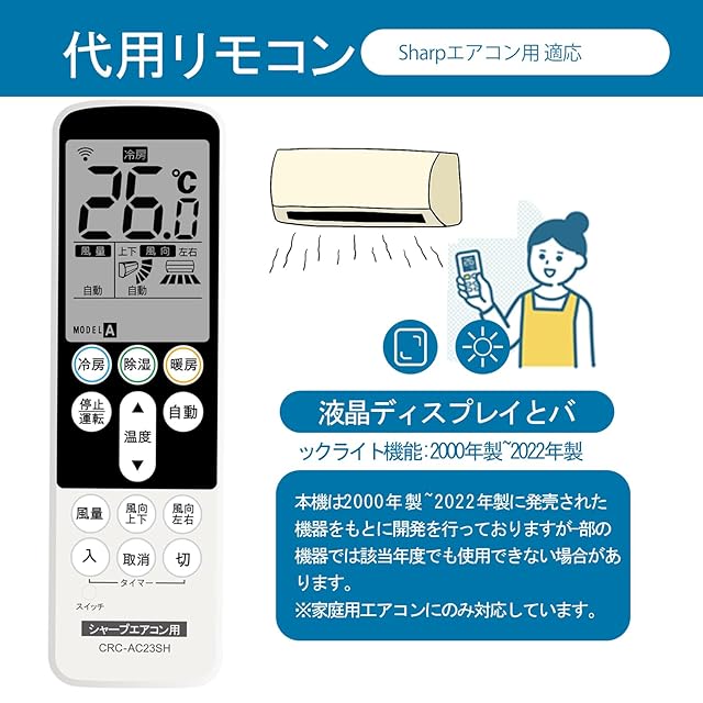 商品名:Sealayer シャープエアコン用リモコン 設定不要 2000~2022年製対応 夜間の操作に便利なバックライト機能付き 日本語説明書付き バックライト 液晶画面 Sharpエアコン用 予約タイマー付き交換 リモコン(シャープ用)