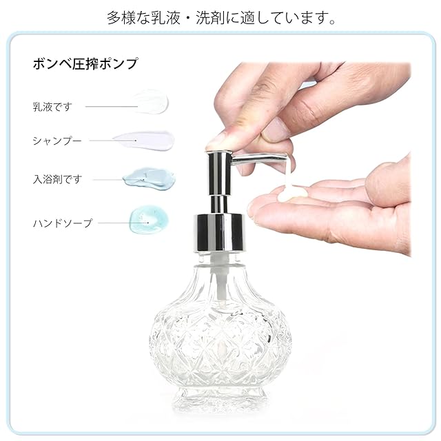 おしゃれな透明ガラス製:透明なガラス製のソープディスペンサーセットです。手洗い用の液体せっけんや、ハンドジェルなどを入れてお使いいただけます。透明なので、中の残量が見やすく、補充のタイミングも掴みやすいです。