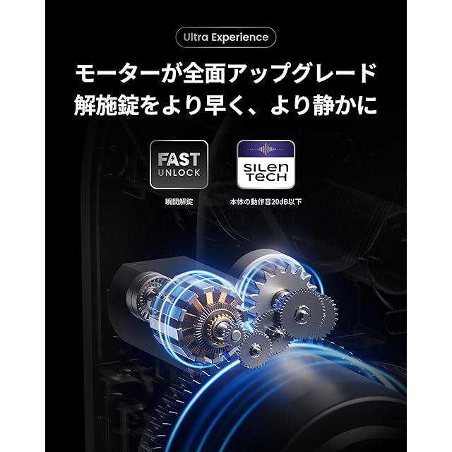 【Ultra Experience - 解錠がより早く、より静かに】モーターの全面アップグレードで、解錠スピードは78.6%、モーターの回転動力は50%(ロックProと比較)向上し、玄関先で鍵が開くまでの待ち時間を「ゼロ」へ。デバイスが常に連携されている状態で、接続や応答を待つことなく、ドアの前に立つだけでスムーズな瞬間解錠が可能です。また、日本初(2024年時点自社調べ)の静音モード搭載。作動音はわずか20dB以下で、毎晩指定した時間に自動で施錠し、モーター音を静音モードに切り替えます。鍵の閉め忘れに対する不安を無くし、夜間の動作も気になりません。