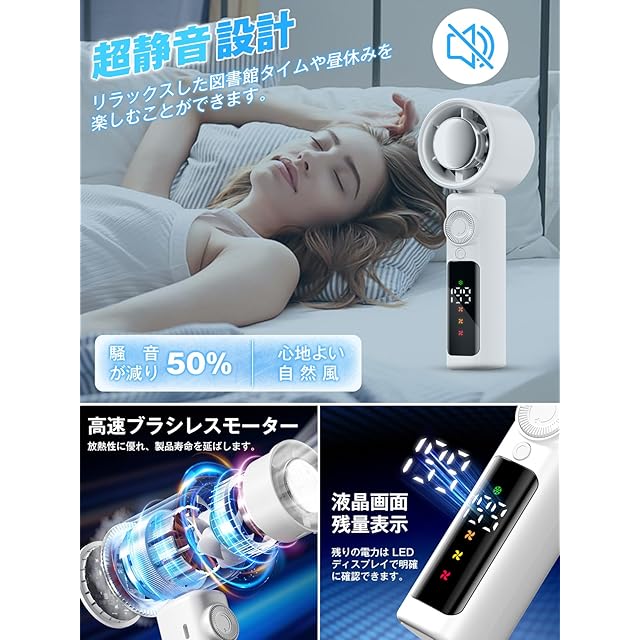【超静音設計 & パッケージ内容】当社のハンドヘルドファンは高速ブラシレスモーターを採用しており、動作時の騒音が非常に静かです。最小風量時の騒音は約29デシベル(dB)と、カフェやオフィスなどの公共空間でも周囲を気にせずご使用いただけます。(※騒音値は使用環境により変動する場合があります)さらに、アルミ製放熱器とメッシュカバーが優れた放熱効果を発揮し、製品の耐久性を高めています。【パッケージ内容】携帯扇風機、充電ケーブル、取扱説明書、ストラップ。