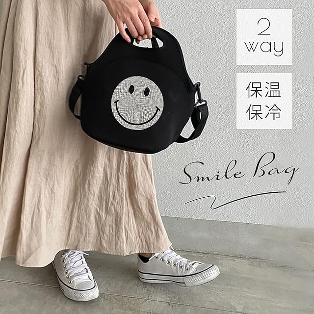 [DIVA Rose] ランチバッグ 保冷 保温 バッグ 2way お弁当 ケース 伸縮素材 お弁当入れ ショルダーバッグ 肩掛け 斜め掛け 軽量 アウトドア (スマイル:シルバー)