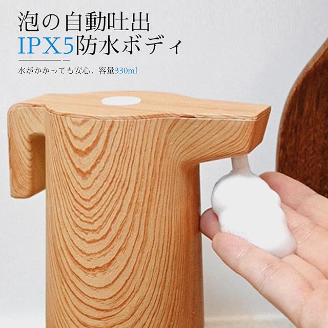 商品名:ソープディスペンサー 泡 自動 ハンドソープディスペンサー オート センサー 330ml 充電式 ハンドソープ 食器用洗剤などに適用 半透明 吐出量3段階調整 壁掛け可(105*80*180mm)木色