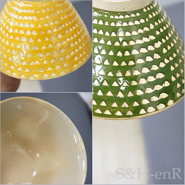 サイズ/口径12.5cm × 高さ 7.3cm 180g/個<br> ※どちらも同サイズ<br> 素材/半磁器<br> 生産地/日本製 長崎県波佐見町<br> <br> 食器洗浄機-使用可○<br> 電子レンジ-使用可○<br> オーブン-使用不可×<br> <br> ※ペア(2個セット)でのお届けとなります。<br> --<br> 波佐見焼きの窯元の中でも人気の高い勲山窯。<br> 一つ一つ丁寧な手作業と伝統的なデザインはもちろんポップで可愛らしいデザインまで、非常に幅のあるアイテムを製作しています。<br> <br> 伝統的な飛びカンナの柄を現代風にアレンジし、判で再現した人気の柄です。<br> 本柄に緑と黄色の組み合わせが、ポップで可愛らしい印象です。半磁器で作成されているので軽量でお手入れも簡単です。 デザインも含め、日常使いの器を作り続けてきた波佐見焼きならではの夫婦茶碗です。<br> 可愛らしく使いやすいお茶碗のため、ご結婚祝いやプレゼントなど贈り物にも人気のアイテムです。<br> (内側のオレンジの斑点や判でつけられる柄の不揃いさは、本製品の特長となります。)