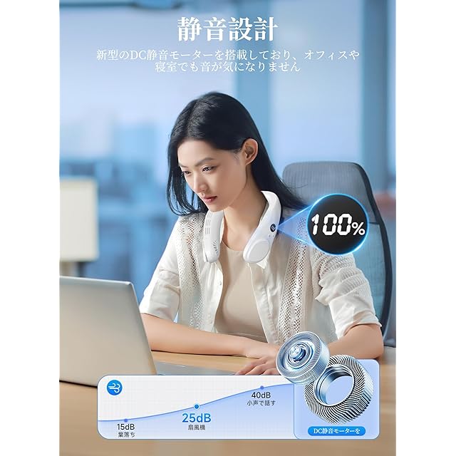 【羽根なし設計・静音設計】 最新の羽根なし設計を採用し、髪の毛や衣服が巻き込まれる心配が一切ありません。エアロダイナミック風道設計により、滑らかで均一な風を提供し、快適な涼しさを実現。さらに、最新のDC静音モーターを搭載し、動作音はわずか20dB以下。図書館のような静かな環境でも周囲に気兼ねなくご利用いただけます。カフェやオフィス、自宅でのリラックスタイムにも最適です