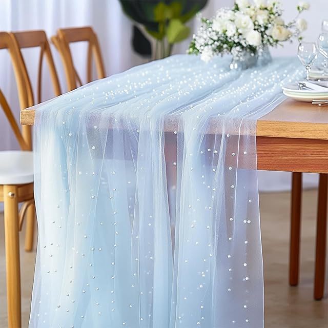 美しいテーブルランナーでテーブル装飾の洗練度を高めましょう。このパールのテーブルクロスは、結婚式のレセプションや特別なイベントにエレガ ンスと魅力を加えます。結婚式、レセプション、ブ ライダルシャワー、バースデーパーティー、バンケット、ホリデー、セレモニー、記念日ディナー、パーティーなどに最適です。<br /><br /><b>仕様</b><br />カラー:ライトブルー<br />素材:パール付きチュール<br />サイズ:300 x 160 cm / 120 x 63 インチ(縦×横)<br />パッキングリスト:テーブルランナー1枚<br /><br /><b>利点</b><br />テーブルランナーは独自の透明なチュール生地で作られており、耐久性があり触り心地が柔らかいです。パールは金属ピンで固定されており、簡単に落ちることはありません。<br />パールデザイン:テーブルクロスのパールのディテールは、微妙な輝きと豪華な質感を加え、テーブルセッティングの視覚的魅力を高めます。<br /><b><br />取扱説明</b><br />テーブルクロスはテーブルの上に平らに敷くか、わずかにプリーツを寄せることができます。床に垂らしたい場合は、10x6フィートの長方形テーブルまたは6フィートの丸テーブルが最適です。<br /><br /><b>注意:自然光とディスプレイ解像度の違いにより、写真で表示される商品の色が実物と若干異なる場合があります。 </b>