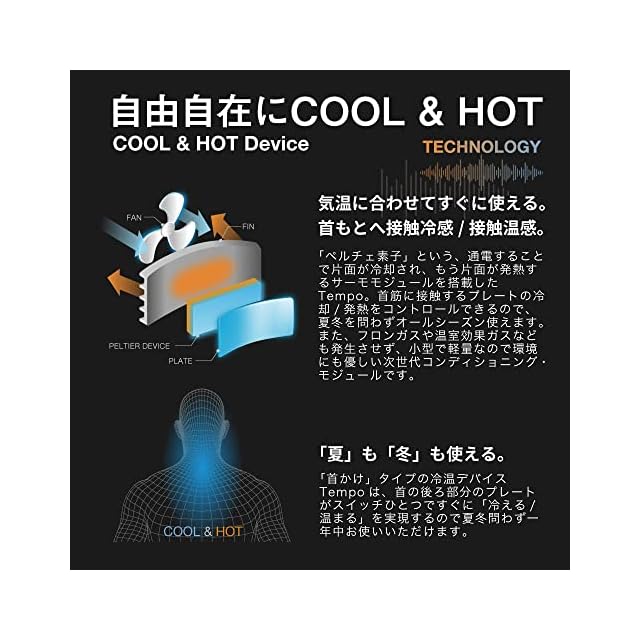 テクノロジーに風をブーストする次世代型ネックファン。夏やひんやり、冬はあったか、オールシーズン対応。ペルチェ素子を用いたプレートを首の後ろ部分にあてることにより。体温調整を手伝います。