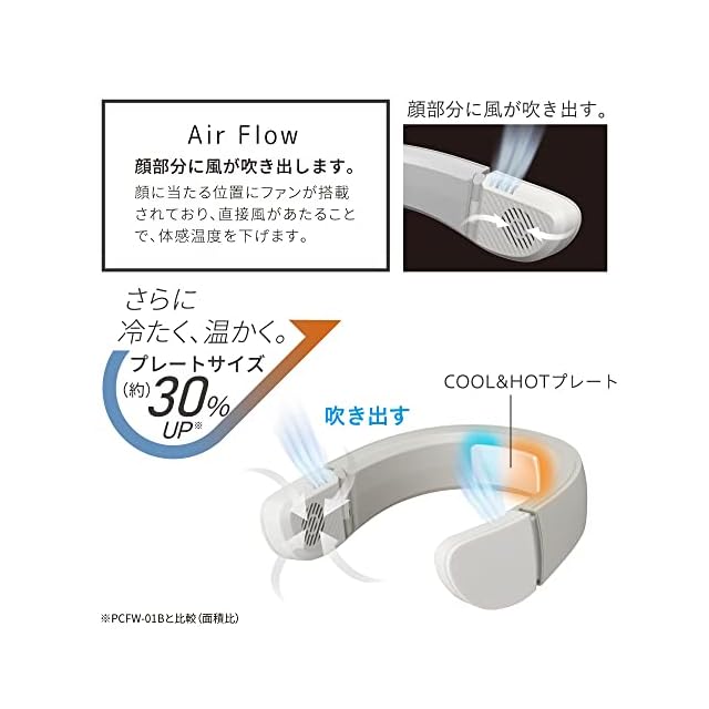 Air Flow 顔部分に風が吹き出します。顔に当たる位置にファンが搭載されており、直接風があたることで、体感温度を下げます。ファン+プレートのハイブリッド。プレートサイズを約30%UPしさらに冷たく、温かく。