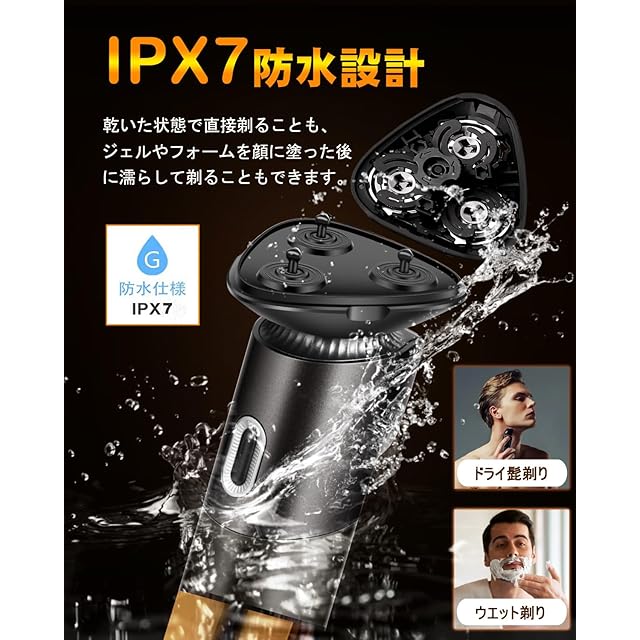 【IPX7全身防水&乾湿両用】メンズ シェーバーの防水レベルはIPX7です。直接乾燥した状態でシェービングすることもできるし、顔にゲルや泡を塗った湿潤状態で剃ることもでき、乾湿両用で、異なるシェービング要求を満たすことができます, 風呂剃り対応なので、ドライシェービングが苦手な皮膚の弱い人でも快適に使用できる可能性があります。きれいにする時は、まずブラシできれいにしてから、ヘッド部分を水で洗って、もっときれいにすることができます。