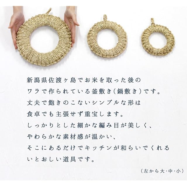 新潟県 佐渡島の職人さんが作った藁の釜敷き(なべ敷き)です。<BR>国産の藁をしっかり編み込んだナベ敷きは非常に丈夫で、この編み込みとドーナツ型の造りによって土鍋などの丸底のものも包み込むようにどっしりと安定してくれます。<BR><BR>こちらの【大サイズ】は3~4人用の土鍋やフライパン、大きめのやかんが合う大きさ。<BR><BR>ワラの素材や編みのあたたかな雰囲気が、和風のみならず、ナチュラルインテリア・北欧風インテリアのキッチンにも相性がよいので人気のアイテム。<BR>ナベ敷きとしての実力はもちろん、吊るしておくだけでかわいらしいのでインテリア雑貨としても力を発揮します。<BR><BR>