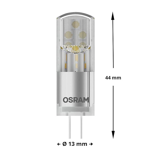 メーカー: OSRAM / オスラム<br/><br/> シリーズ名: LED STAR PIN<br/> 定格消費電力: 2.4W ( 2.4ワット )<br/><br/> 【口金付近が円柱形になっていますので、ご使用の器具に収まるかをご確認下さい。】<br/><br/> ハロゲンランプ OSRAM 64425S(J12V20W-AXS)同等品 <br/><br/> 電力:2.4 W<br/> 定格光束:300 lm<br/> 光色:warm white<br/> 直径:13.0 mm<br/> 定格ランプ残存率:15,000時間<br/> メーカー品番:LED STAR PIN 30<br/> 電圧:AC/DC 12V(12V電子トランス使用)<br/> 演色評価指数:Ra80<br/> 色温度:2700K<br/> 長さ:44.0 mm<br/> ベース:G4<br/> 調光器:非対応<br/><br/> 【注意】<br/> ・バルブが割れたままでは絶対に点灯しないでください。(感電、破損、落下によるケガの原因)<br/> ・分解や改造はしないでください。<br/> 定格寿命15000時間は設計寿命です。定格寿命は平均値であり、値ではありません。<br/> ・ランプの周囲温度が40℃を超える場所では使用しないで下さい。 また、定格寿命を経過したランプは交換をおすすめします。<br/> ・人感センサ・照度センサ・遅れスイッチの付いた器具・防犯用点滅機能の付いた器具には使用できません。<br/> ・ラジオやテレビなどの音響機器および映像機器の近くで点灯しますと、雑音が入ることがありますのでご注意ください。 (雑音が入るときはランプと機器を1m以上離して使用してください)<br/> ・赤外線リモコンを採用した機器(テレビやエアコンなど)の近くで点灯しますと、リモコンが誤作動することがあります。<br/> ・ランプを長時間直視するのはおやめください。目に悪影響をおよぼすおそれがあります。<br/> ・電子点滅器では使用しないでください。電子点滅器の故障の原因となります。<br/> ・一般電球と比べ、点灯・消灯が遅れる場合があります。 LED素子には光色・明るさにバラつきがあるため、同じ形名の商品でも、光色・明るさが異なることがあります。<br/> ・明るさ、光色、中心温度および配光(光の広がり方)が電球とは異なります。<br/> ・点灯流や消灯後しばらくはランプが熱いので絶対に手や肌などをふれないでください。(ヤケドの原因)<br/> ・ランプは屋内で使用してください。雨や水滴のかかる状態や、湿度の高いところで使用しないでください。 (絶縁不良、破壊、落下の原因)<br/> ・ランプと器具に振動や衝撃を与えないでください。(短寿命、破損、落下、ケガの原因)<br/> ・ご使用になる電子トランスの種類によってはチラつきが発生する場合があります。<br/> ・ご使用になる環境及び電子トランスの特性によっては寿命が短くなる場合があります。<br/><br/> 関連キーワード<br/> LED ハロゲン 電球 ランプ J12V 20W J12V20W ローボルト 12V 12V20W G4