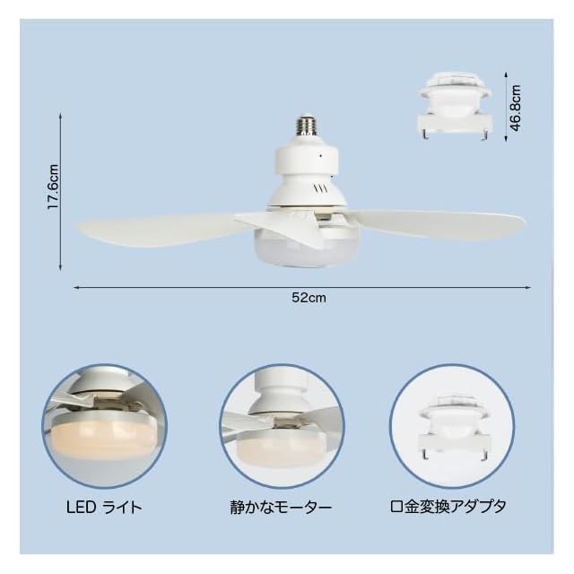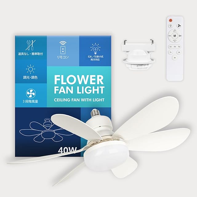 工事不要:取り付けが非常に簡単で、ファン付き電球をソケットにねじ込むだけです。<BR> メモリ機能:リモコンでライトを点けた時に前回のライトの色と明るさの記憶状態を保持します。<BR> 風速&調光機能:リモコンで照明の色温度と風速を調整できます。2700K~6500Kの調光可能で、低速、中速、高速の3段階の風速が必要に応じて調整できます。<BR> 照明のみやファンのみの使用も選択できます。<BR> 幅広い用途:当社のリモコン付きライト付き天井ファンは、ガレージ、キッチン、収納室、バルコニー、屋根裏部屋、ユーティリティルーム、クローゼット、ダイニングルーム、作業台、地下室、物置、ランドリーエリアなど、空気循環が必要なコンパクトなスペースに最適です。<BR> 急停止保護機能:センサーが装備されており、体が触れるとファンの羽根が即座に回転を停止します。 <BR><BR> タイミング機能<BR> よりリラックスした睡眠のために、ソケットファンの消灯時間を設定できます。簡単に時間を管理し、追跡するのに役立ちます。<BR><BR> 新しいリモコン<BR> プログラムやペアリングの必要はなく、2本のAAA電池(別売)を入れるだけですぐに使用できます。他の押しにくい小型リモコンと比較して、私たちのリモコンは握りやすく、安定した信号を持ち、一手で簡単に操作できます。 <BR><BR> 静音モーター<BR> 内蔵の静音モーターにより、家族の睡眠を妨げることはありません。また、ソケットファンが動作中でも、騒音の心配なく仕事に集中できます。<BR><BR> LED シーリングライト ファン付き 6センサー機能<BR> このソケットファンには内部にセンサーが装備されており、体が触れるとファンの羽根が即座に回転を停止します。これにより、あなたとご家族により安心感を提供します。 <BR><BR> 6枚のファンブレード<BR> 6枚のファンブレードにより、空気の流れが効率的に改善され、迅速に空間を涼しくします。3段階の風速を必要に応じて設定できます。<BR><BR> 仕様:<BR> 入力電圧 85-265v~ 50/60Hz<BR> ワット数 40w<BR> CCT 3000~6500K<BR> 風速 弱・中・強<BR> 制御モード リモコン/壁スイッチ<BR> メモリー機能<BR> タイマー <BR> 急停止保護装置<BR><BR> 注意事項<BR><BR> 取り付け前に、ベースが緩んでいないかを慎重に確認してください。ベースが十分に安定していない場合、ソケットファンが動作中に揺れる原因となることがあります。<BR> ソケットエクステンダーについて、ベースが埋め込み型でない場合は、提供された延長ソケットを使用する必要はありません。ランプヘッドが長すぎて、ファンが動作中に若干の揺れが発生する可能性があります。<BR> 睡眠時には風速を2段階に設定することをお勧めします。これにより、インペラの音が低減され、風邪を予防することができます。