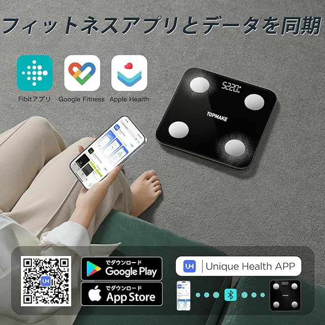 【データ管理と同期】「アプリ:Unique Health」は iOS/Android のユーザーに使えます。99%の携帯電話に対応しています。アプリ内のデータは、Appleのヘルスケア、Google Fit、Fitbitと同期ができます。充実な測定データ、測定値の変動傾向により、体調管理やダイエットの人たちにも最適!
