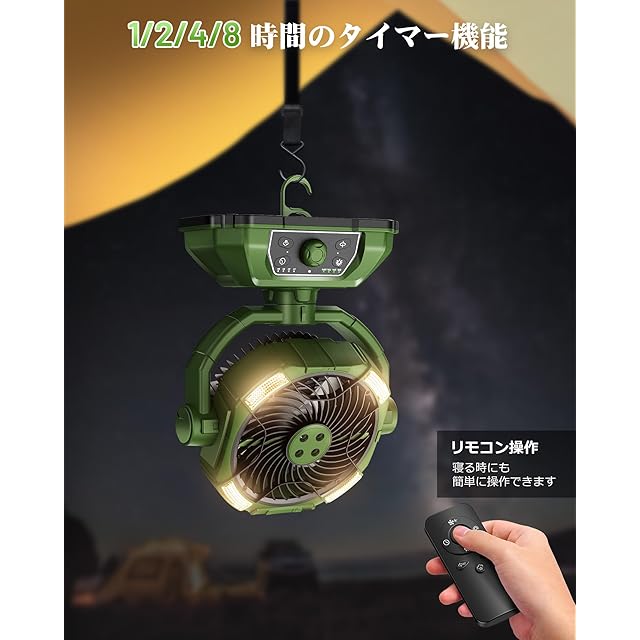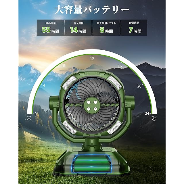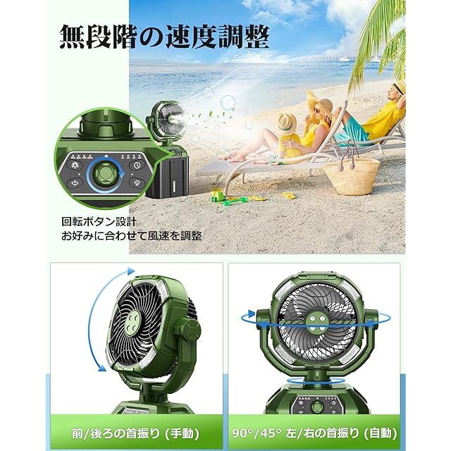 【 限定ブランド】キャンプ 扇風機 ミストファン 自動首振り 超強風 最大55時間連続使用 風量無段階調節 充電式 リモコン付き タイマー機能 低騒音 多機能 吊り下げ サーキュレーター 卓上 扇風機 防災 キャンプ用品 テントマット コンパクト 持ち運び便利 屋内/アウトドア両用 熱中症対策 日本語取説付 (グリーン)