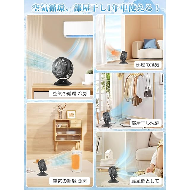【全年用サーキュレーター】エアコンとの併用で夏の室温バランスを整え、冷気を足元から部屋全体へ循環させ、エネルギーと電気を節約。除湿機との組み合わせで春の湿度調整、梅雨時の衣類乾燥や換気、加湿器との併用で秋の湿度均一化、ヒーターとの連携で冬の暖気流速アップ。エアコンとの併用により、より一層の省エネ効果が期待できます。狭いスペースでも、広い部屋でも、この扇風機はあなたの夏を快適にサポートします。