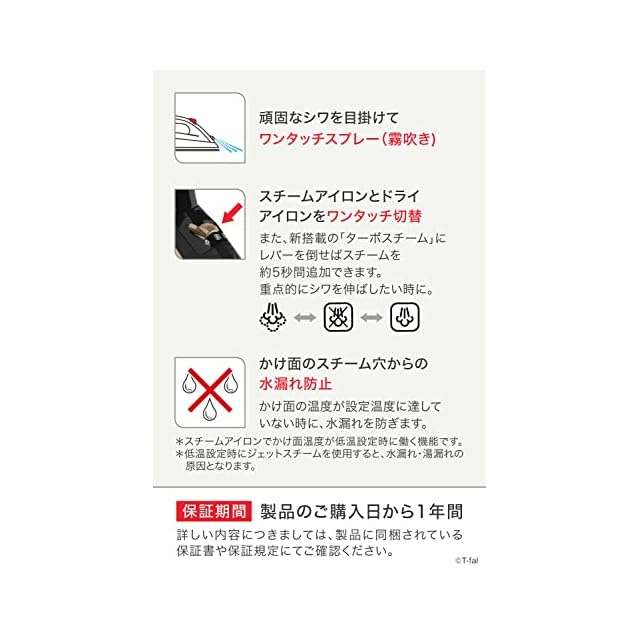 【仕上がりに差がつく「エアーグライド」かけ面】ティファール独自の「エアーグライド」は、長年の研究で開発されたアイロンかけ面です。最適なスチーム拡散で効率よくシワを伸ばし、傷がつきにくく耐久性にも優れ、ジッパー周りなどのアイロンがけも安心です。
