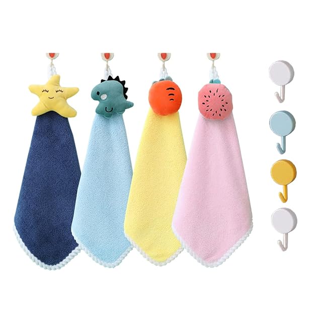 【商品仕様】タオルのサイズ:44*36cm .青、パープル、ピンク、グリーンで4色からなる手拭きタオルセット。フックも4つ付属。(フックの色はランダムです)。