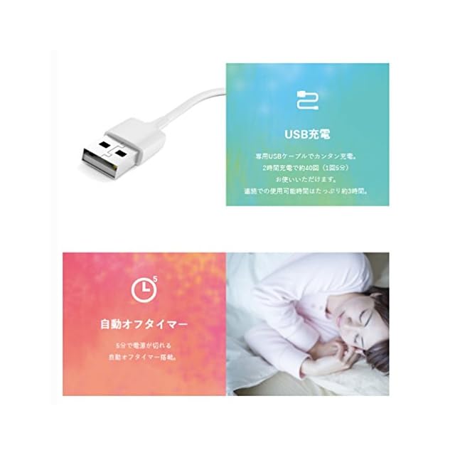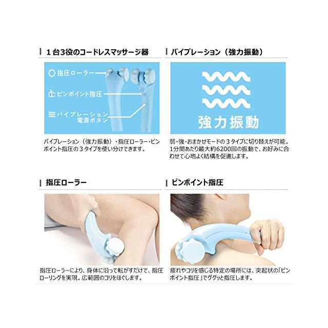 振動回数:強:約6,200回/分、弱:約5,400回/分、動作時間:約3時間、充電時間:約2時間、タイマー:5分