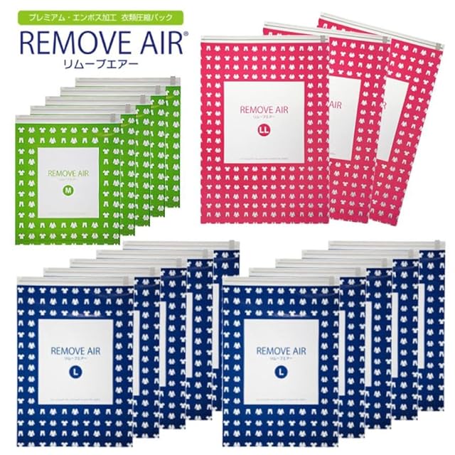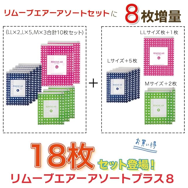 リムーブエアー 衣類圧縮袋 18枚セットアソートプラス8 日本製 エンボス加工あり 旅行用 掃除機不要 収納用