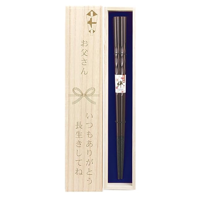 彫柄のある、シックなイメージのお箸です。箸先にはすべり止めがついております。「お父さん いつもありがとう 長生きしてね」と彫刻した桐箱にお入れしてのお届けです。ラッピング済みですぐにお渡しが出来ます。◆◆◆ラッピングは予告なく変更になる場合がございます◆◆◆