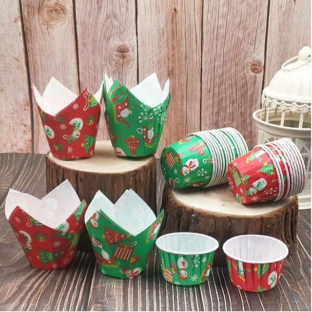 クリスマス マフィンカップ 100枚 ケーキカップ 耐熱カップ おかずカップ ベーキングカップ 紙製 使い捨て ケーキ型 おしゃれ DIY 製菓用品 (50枚グリーン+50枚レッド(セットB))