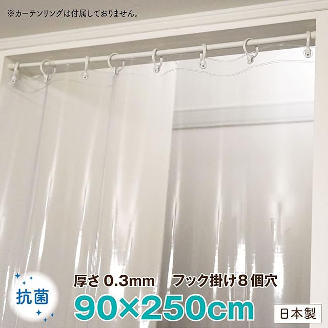 ★リングをセットする部分に補強加工してあるため、長期間つりさげておいても丈夫です。<br> ★玄関や階段、お部屋の間仕切り ウイルス対策 飛沫防止 レジカウンターetcにもOK!<br> ★スペースに合わせて自由にカットができます! <br> ★対面での飛沫防止用シートとしてやお部屋の出入り口に掛けて冷暖房の効率UPも!<br> ★いつも快適! 防カビ素材のため清潔に安心して使用できます。<br> ★バスルームの湿気を外に逃がしにくいので保温効果があります。<br> ★洗面スペース・キッチン・お部屋の目隠しや仕切りにも便利です。<br><br> ●サイズ:(約)幅90×丈250cm<br> ●材 質:PVC(抗菌・防カビ)<br> ●日本製<br><br> 【備 考】<br> カーテンリングは付属しておりません。<br> <br>