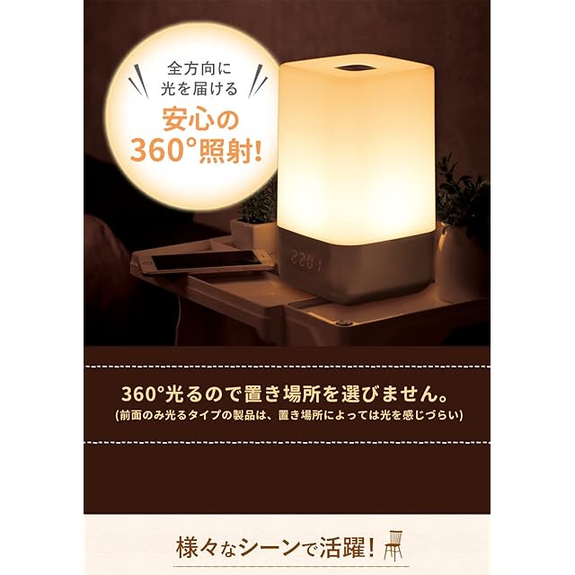【鳥のさえずりや波音・鐘音など5種類のアラーム音】慣れるまで光だけでの起床が不安な方に、自然な心地の良い5種類のアラーム音を収録。「光だけ」「アラームだけ」「光+アラーム」など自分に合った起床方法で気持ちの良い朝を迎えられます。