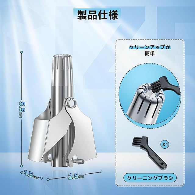 【使いやすい&水洗いOK】先端を鼻に入れて、レバーを握ります。 センターブレードが回転し、拡張されたノーズを切り取ります。 ステンレス製なので、丸洗い可能です。 使用後はクリーニングブラシで洗浄し、水で直接洗浄するだけで、錆びません。