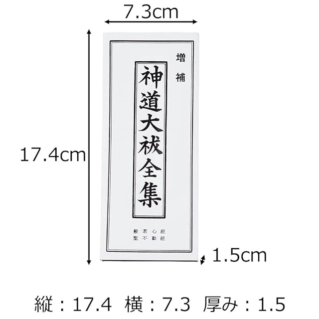 神道の方が主に読まれる祝詞をまとめた本です。<br>身滌大祓、大祓詞、六根清浄大祓、三種太祓、天地一切清浄祓、一切成就祓、奉幣式祝辭、元日、御年神祭、神饌祝詞、御酒祝詞、潔齋祝詞、鳥居之祓、伊勢内宮神前祝詞、伊勢外宮神前祝詞、産生神祓、最上祓、最要祓、大元造化三神報恩の祈詞、五元之神を拝む辭、先祖霊屋祭辭、神傳をしへの一言、大道神祇祗、大日本国々一ノ宮、十種神寶、十種太祓、大国神甲子祝文、恵比須神祝詞、稲荷大明神祓、稲荷大神秘文、金毘羅神祓、天満宮祝文、粟島神巳待祓、庚申祓、鎮火祝詞、日待之祓、月待之祓、地鎮祭招神祝詞、地鎮祭祝辭、清祓式開場祝辭、山神祓、海神祓、船玉祓、釜所神祝詞、竈神祭、井戸神祭祓、井神祭、井神祭祝辭、釿始祭、柱立、棟祭、屋堅之祓、衢神祝詞、障神祭、賽神之祝詞、三科祓、疫病祓、祈病祝詞、祈家内安全、祈念祝詞、雨乞祝詞、祖先の霊社に向て申す詞、同略文、粗廟霊鎮祓、神拝之次第、俗神拝次第、遙拝神詞、神供祝詞、降来要文、送納要文、略神拝次第、御食御酒の祝詞、神酒祝詞、神家故賽、神家忌詞内七言外七言、奉幣之式、般若心経などが書かれています。<br><br>【素材】<br>紙<br>【商品寸法(cm)】<br>縦:17.4 横:7.3 厚み:1.5