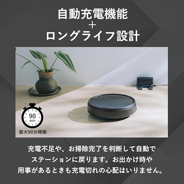 【ロボットクリーナー 説明3】ボタン1つでスタートから充電まで 部屋中の掃除をおまかせでき、終わったら自動で充電ステーションへ。 お出かけの時も、用事がある時も、充電切れの心配はいりません。 忙しい毎日でも、無理なくきれいな部屋をキープします。