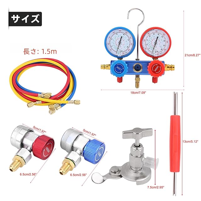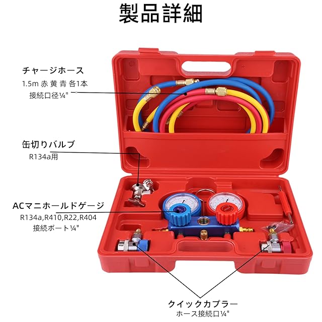R134aマニホールドメーターキット:3連マニホールドゲージ、カラー識別ホース(1.5m×3)、R134aクイックコネクター×2、穿孔タップ、R410Aアダプター、バルブコア工具付属。【注:新旧の商品はランダムにされますので、ご注文の前に気にしないでください。】