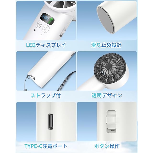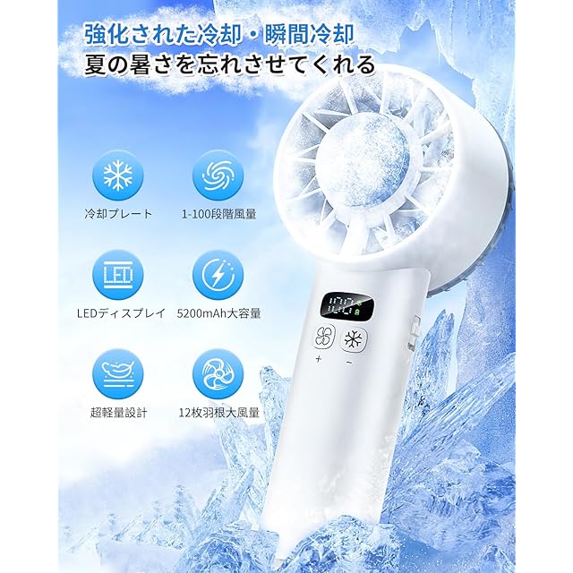 【2025夏新設計 -25℃瞬間冷却】携帯扇風機 冷却プレート ハンディファン 12枚羽根 強力送風 1-100段階風量調節 5200mAh大容量 Type-C充電式 LEDディスプレイ クーラー機能 手持ち扇風機 軽量 強力 小型 卓上扇風機 ストラップ付き スポーツ観戦/花火大会/オフィス/アウトドアなどに適用(ホワイト)