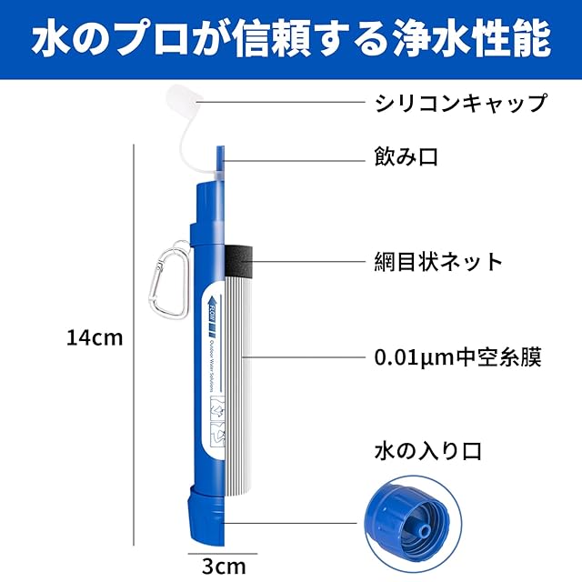 【軽量コンパクト設計】この携帯浄水器 は長さ14cm、直径3cmしかなく、28mmのねじ瓶、コップ、グラスに適しています。約50gの重さで、手のひら、ポケット、フィットネスバッグ、リュックサック、ライフバッグ、財布に入れることができます。