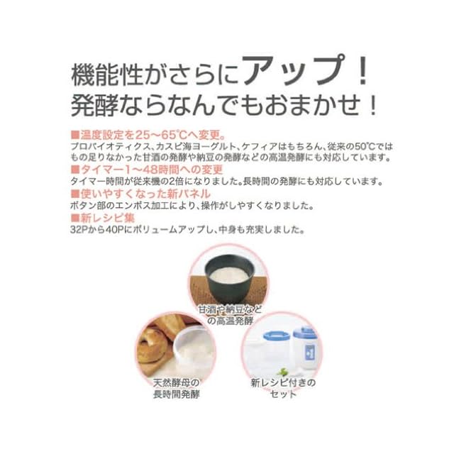 ●商品説明:牛乳1本と種菌がらくらくはいる、最大容量1.2Lのヨーグルトメーカーです。付属のヨーグルトスプーンで取り出しも楽々、内容器とスプーンは消毒対応なので手間もかかりません。温度設定温度は、25度から65度。市販ヨーグルトからカスピ海ヨーグルト、ケフィアヨーグルトに納豆、甘酒までこれ一台で作ることができます。また1から48時間のタイマーも付いています。