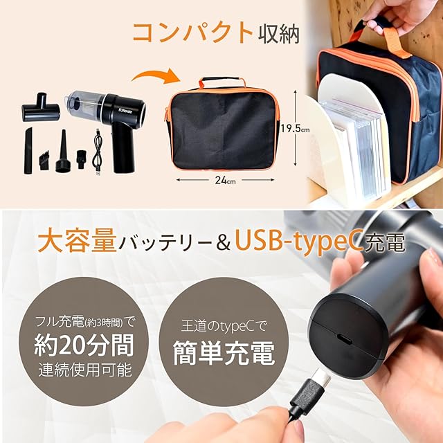 商品名:【FUNovate】ハンディクリーナー 収納袋付き 強力吸引 車用掃除 TypeC エアダスター 軽量 小型 ちいさな掃除機 ハンディ掃除機 ハンドクリーナー 多機能 家庭用 車用 PC 卓上 カー 黒