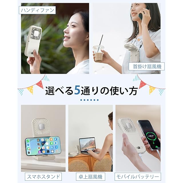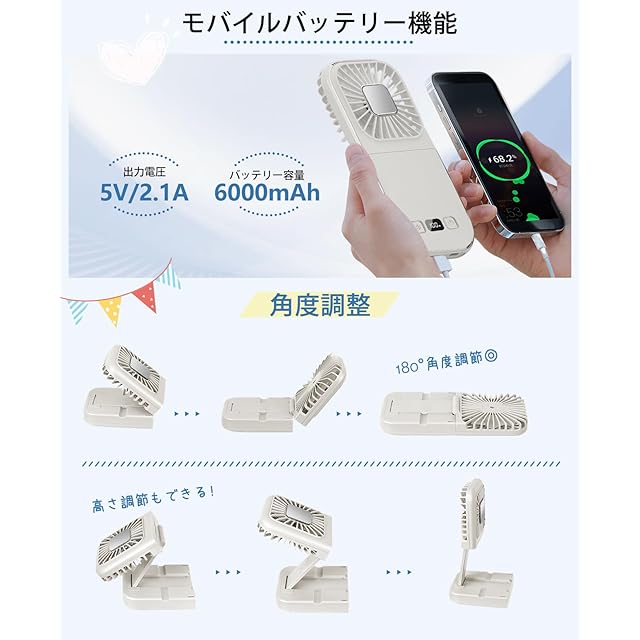 【よりコンパクトで持ち運びに便利&実用性抜群な「モバイルバッテリー」機能】約20mmの薄型ボディなら、小さなバッグやポケットにもすっぽり収まって携帯性抜群!コンパクトに2つ折りできるハンディファンなので、使用しない時は、引き出しや棚などの僅かなスペースに収納可能です。スマホより軽い約208g。長時間首にかけたり手で持って使用しても負担になりにくいです。さらに6000mAhのバッテリーとしてスマホの充電ができる!夏のレジャーは、キャンプや花火、海水浴など長時間のお出かけ時は電源の確保ができモバイルバッテリーとしても使えます。