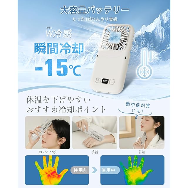 【冷却プレートで一気にクールダウン】「極冷」冷却プレート搭載のハンディファンがKemolpoから新登場!冷却ボタンを押してわずか1秒でキリっと冷えた缶ジュースを当てたような爽快さを感じられます。ファンの風だけでなく、プレートがひんやり冷たくなり、おでこや手首など直に当てて、素早く冷やすことができます。いつでもどこでもひんやり涼しくなり、真夏の暑さ対策にぴったりのハンディファンです。*冷却機能は送風時に使用できます。冷却機能の単独使用はできません。