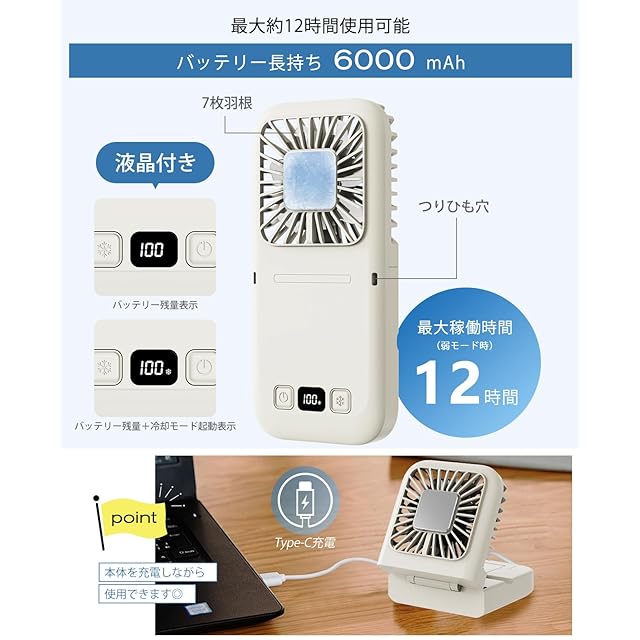 【6000mAh電池容量アップ&風量/電池残量表示】前モデルより約1.2倍の6000mAh大容量にアップグレード!最大約12時間連続送風とKemolpoのハンディファンの中でも最も長持ちします。一度の充電で一日中ひんやり快適。充電時間は約3時間なので、夜充電しておけば翌日長時間使用可能です。スマホやPCのチャージャー規格にも多いUSB Type-Cを採用。風量/電池残量/低電力/充電中/満充電の場合はデジタル表示されひと目で分かるようになっています。外出先でもパッと見てわかりやすく、充電するタイミングを判断しやすくて安心してご使用いただけます。