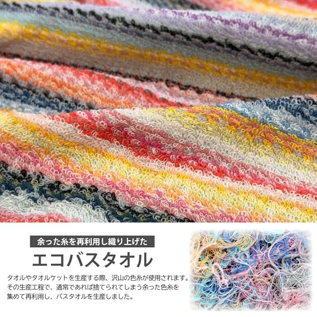 残糸で織りあげたバスタオルです。残糸とは、タオルの生産工程で余ってしまった糸のことです。大量生産するには量が足りない。そんな糸を集めて織り上げたバスタオルです。残糸バスタオルは色々な糸を使用しておりますのでカラフルな色使いとなります。また、色々な糸を使用しておりますので、画像とはやや異なる色柄や、厚みやサイズが若干異なる場合がございます。タオルの特性上、色物は色落ち、色移りすることがありますので、洗濯ネットを使用し単独洗いをしてください。塩素系漂白剤は使用しないでください。タンブラー乾燥は縮みの原因となりますのでお避け下さい。