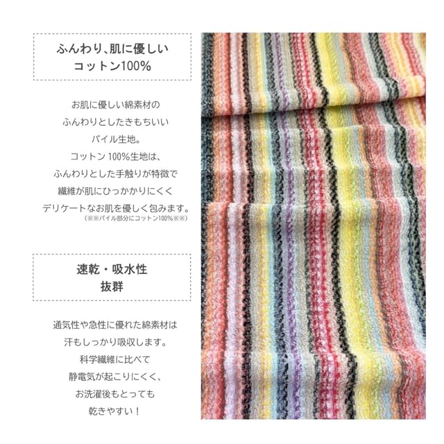 ふんわり、肌に優しいパイル地のコットン100%。繊維が肌にひっかかりにくく、デリケートな肌を優しくつつみます。