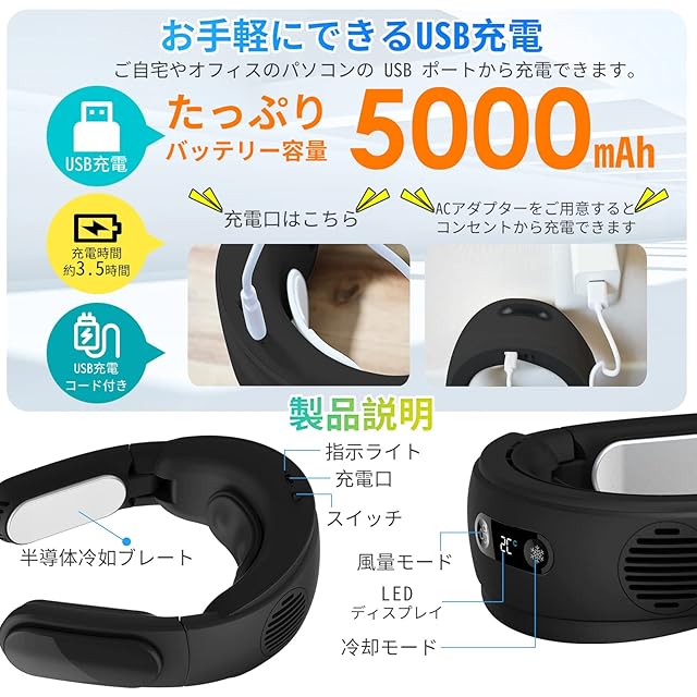 【5000mAh大容量バッテリー・Type-C急速充電】PSE認証済みの5000mAhの大容量バッテリーを内蔵、さらに電源回路は13重の安全設計で安全性もバッチリです、出風モードでは大10.5時間の電池持ちが可能となります(冷却モードでの連続稼動時間は4Hで)。TYPE-C急速充電に対応でき、わずか3.5時間でフル充電できる携帯扇風機です、一日中涼しい空気の流れを楽しむことができます。