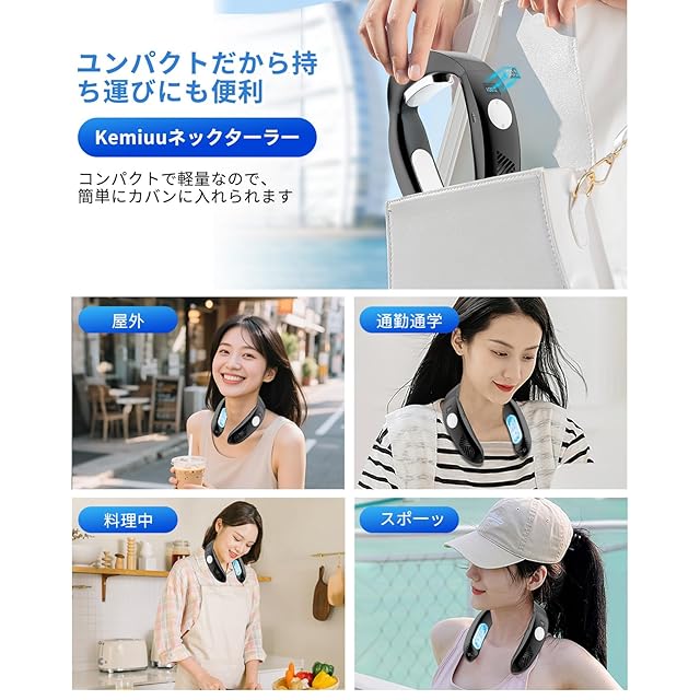 【静音設計・超軽量】従来の首掛け扇風機と違い、ペルチェ素子の温度変化で冷やしたり温めたりするネッククーラーなので、静かなオフィスをはじめ、電車やバスの車内でも安心して利用できる静音性の高いモデルです。わずか280gで長時間かけっぱなしでも違和感がありません。コンパクトに収納できるので、バッグに入れて持ち運びにも便利です。丸1日外出する夏場のお出かけや屋外での作業時に最適なネッククーラーです。