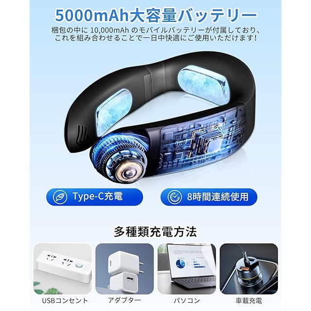 【最強3つ冷却プレート搭載・2秒で瞬間冷却 】最先端の半導体冷却技術を使って冷却プレートを首元に当てて瞬時にクールダウンできます。従来の2つ冷却プレートより進化した3つの冷却プレートが搭載しております。冷却面積UP!冷感ももっと強い!さらに 2秒で肌に冷たさを伝え、冷たい缶を肌に密着させているようなひんやり感です。長い時間冷たさが持続できます。炎天下な夏の日でも快適に過ごせます。